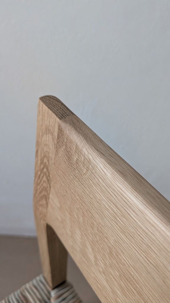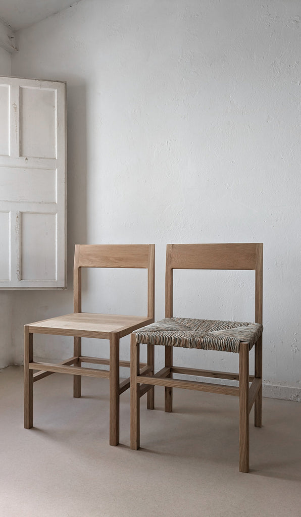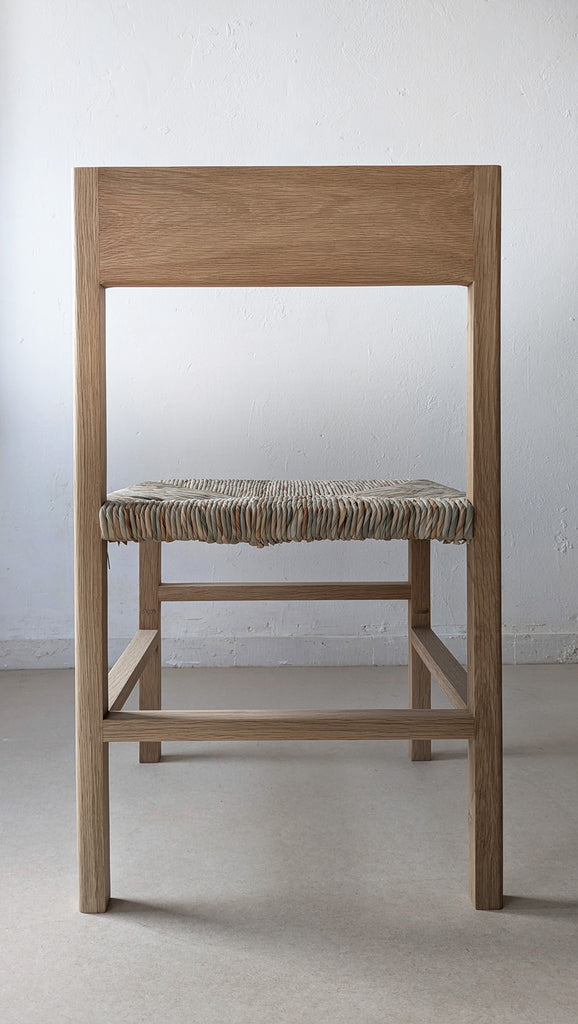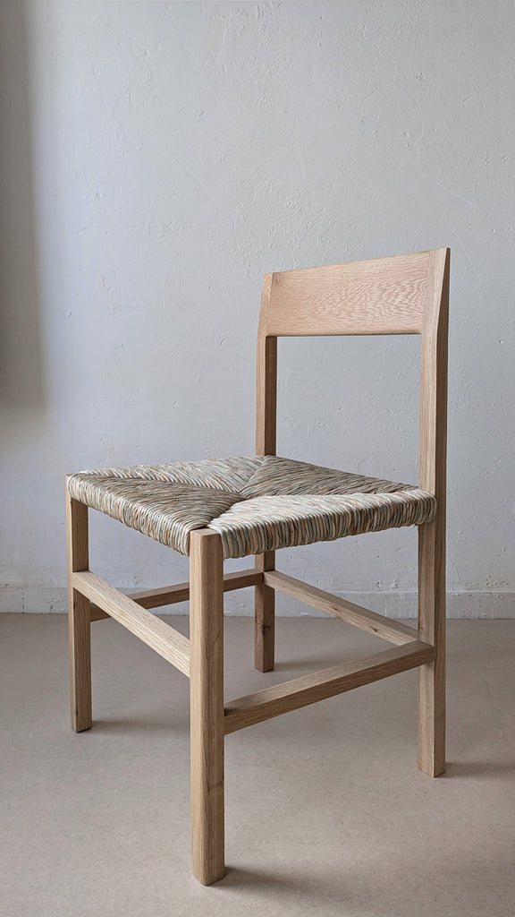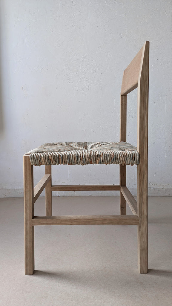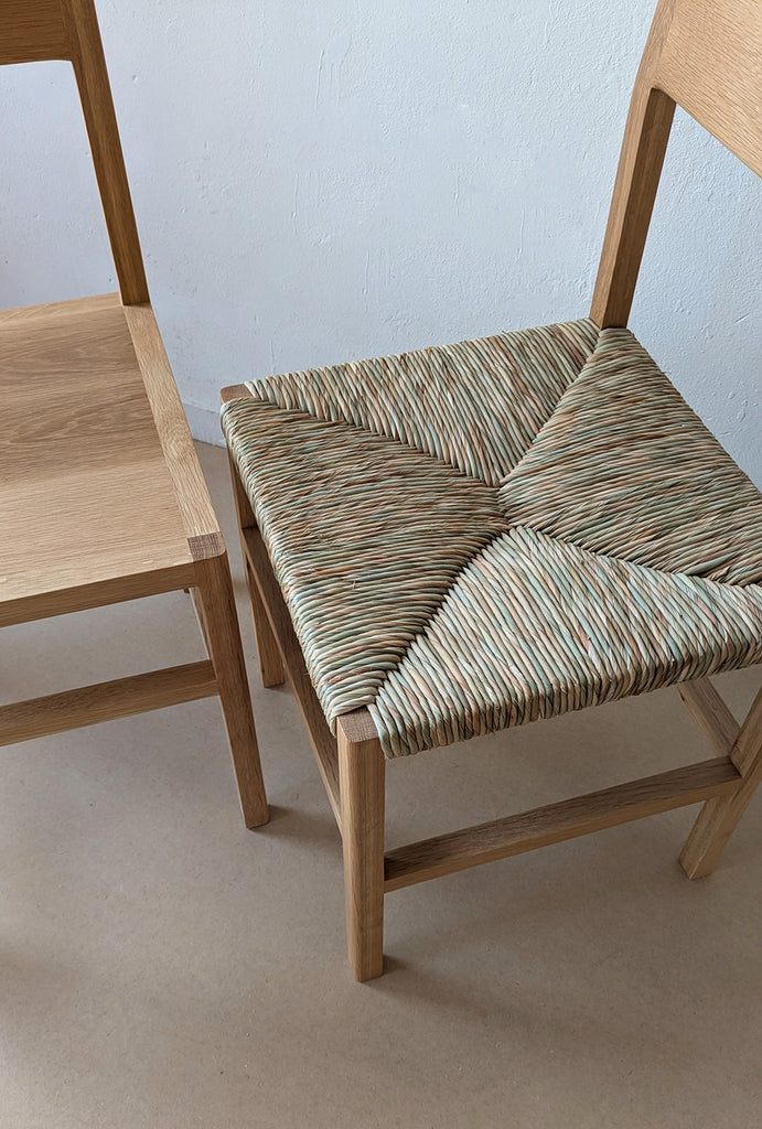 Silla de madera de roble macizo USA de primera calidad con asiento trenzado de enea y respaldo en madera de roble. Estructura completamente mecanizada y encolada en una única pieza.