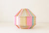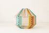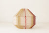 Pantalla exagonal de hierro lacado en blanco o negro cubierta con hilo trenzado de distintos colores (según modelo). Aunque en las lámparas del mismo modelo se repitan los colores, el uso de éstos en la composición del tejido es distinto en cada una de ellas, haciendo que cada lámpara sea única.