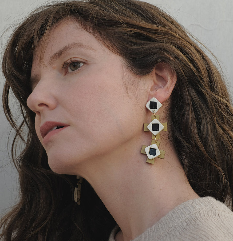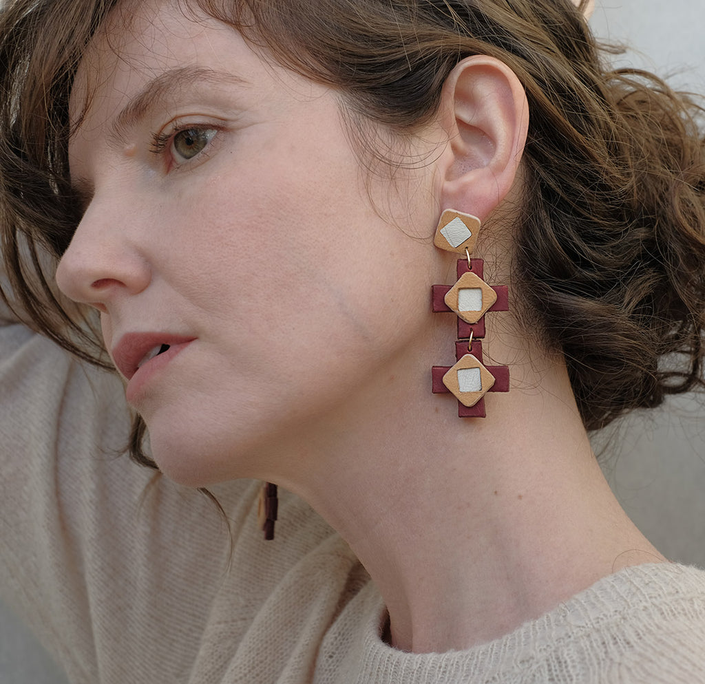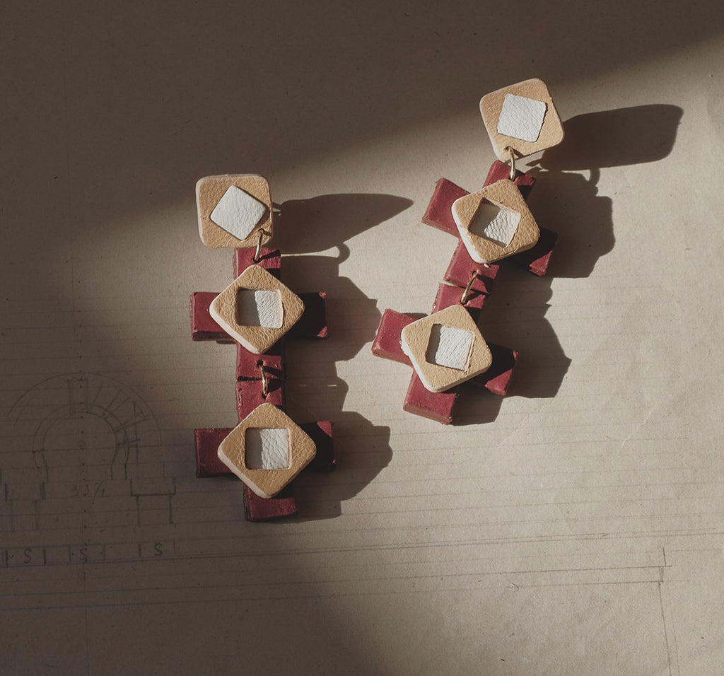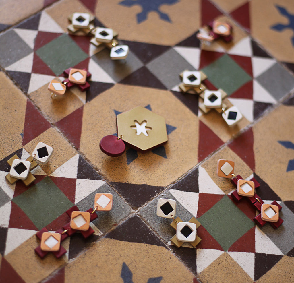 Pendientes Victoria Maxi, realizados artesanalmente. Inspirados en las geometrías de los azulejos hidráulicos tradicionales. Compuestos por dos cruces griegas y cuadrados de diferentes tonos y espesores, son un juego de colores, superposiciones y profundidades. Están llenos de detalles y sutilezas que los hacen muy especiales. Ligeros y elegantes, son el complemento perfecto tanto para grandes ocasiones como para alegrar el día a día.