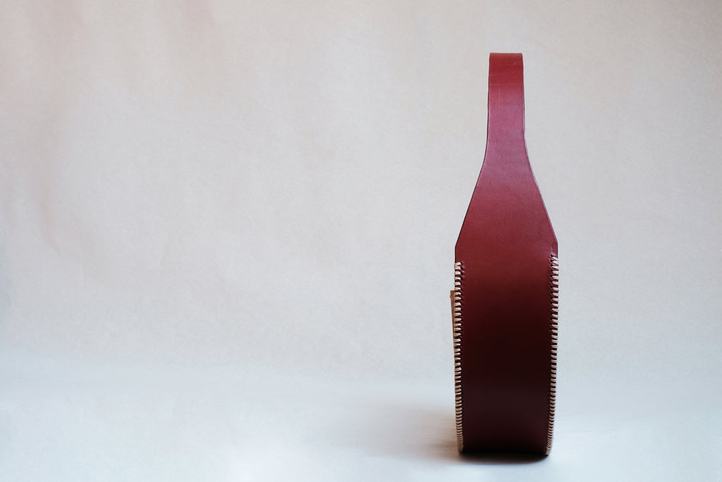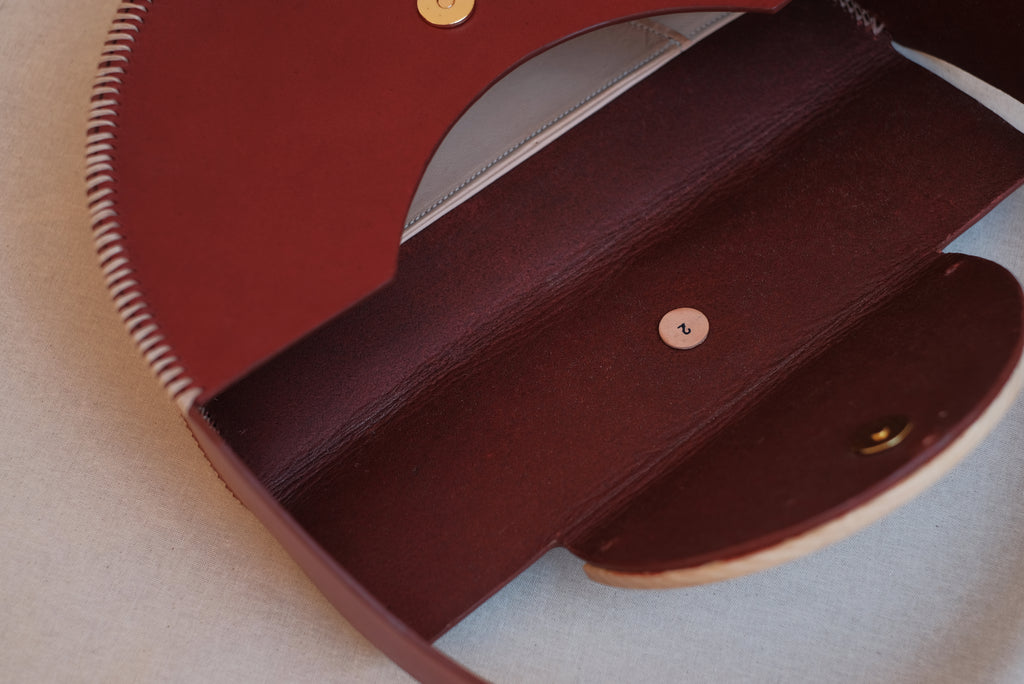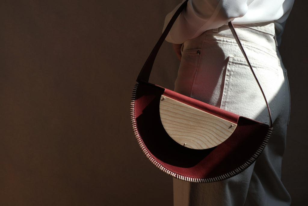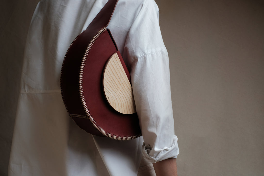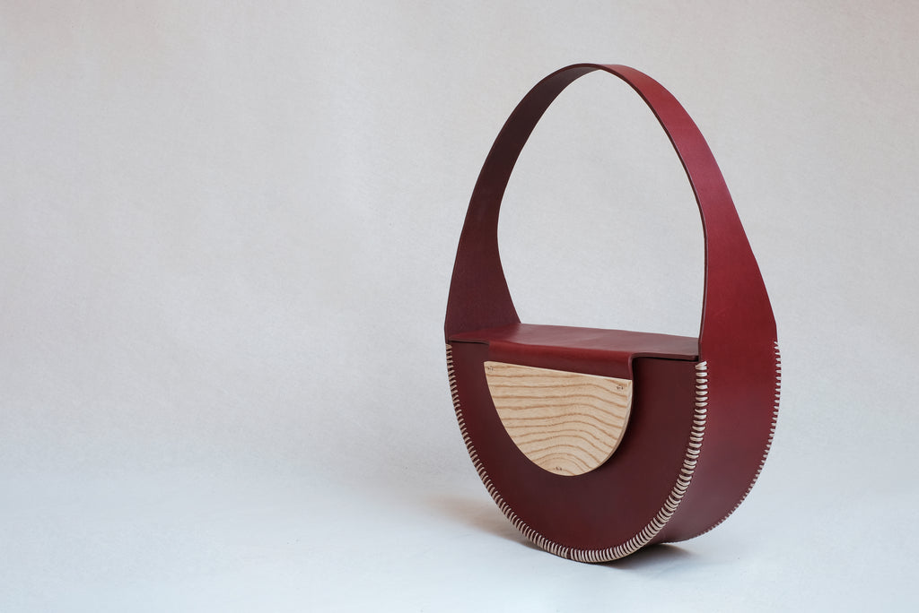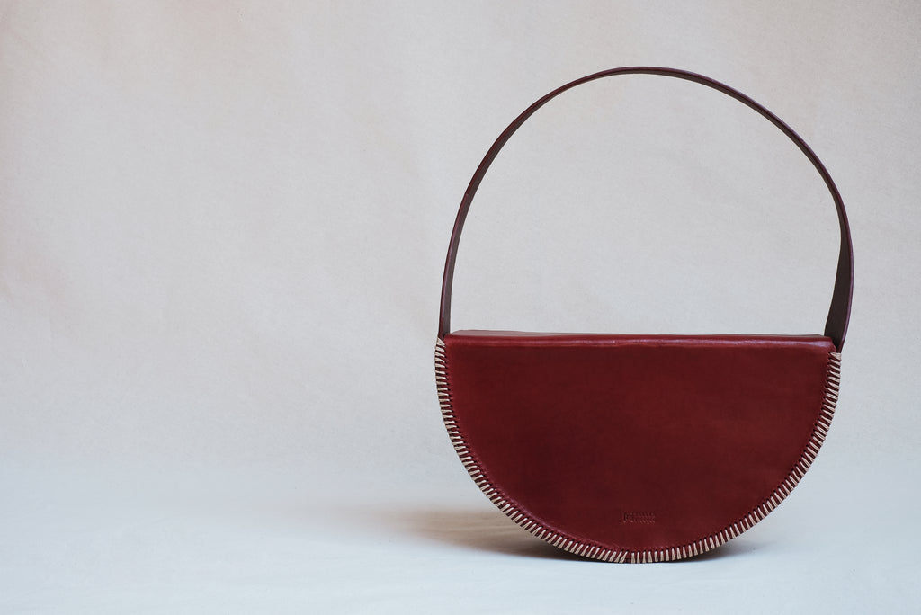 This bag is formed by three pieces of leather modelled to acquire a geometric and rigid shape. It is sewn entirely by hand using cross seams on the edges to reinforce its primitive character and contrast with its geometry. All the edges have been burnished and hand painted with water-based paints. The handle is completely integrated into the structure of the bag and has an intermediate size that allows it to be hung from the arm or shoulder.