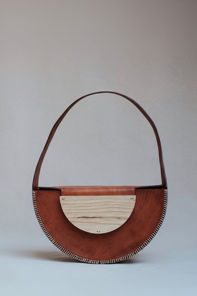 This bag is formed by three pieces of leather modelled to acquire a geometric and rigid shape. It is sewn entirely by hand using cross seams on the edges to reinforce its primitive character and contrast with its geometry. All the edges have been burnished and hand painted with water-based paints. The handle is completely integrated into the structure of the bag and has an intermediate size that allows it to be hung from the arm or shoulder.