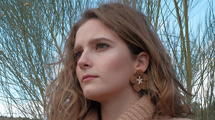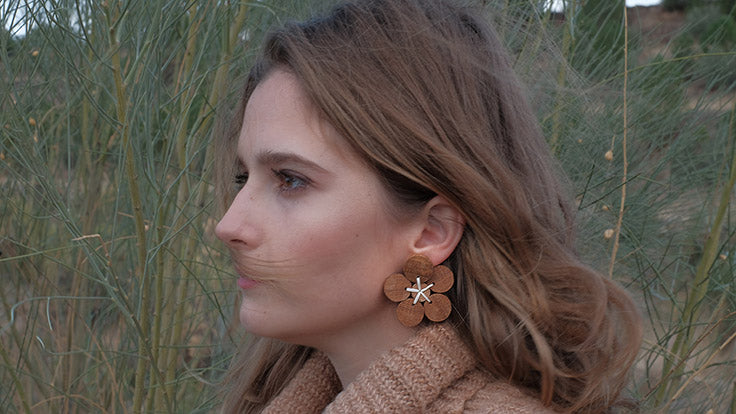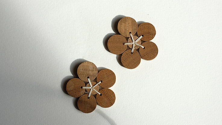 Flower-shaped earrings made up of six oak wood circles of different diameters sewn together using ivory-coloured thread. Butterfly clasp. For pierced ears.