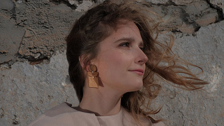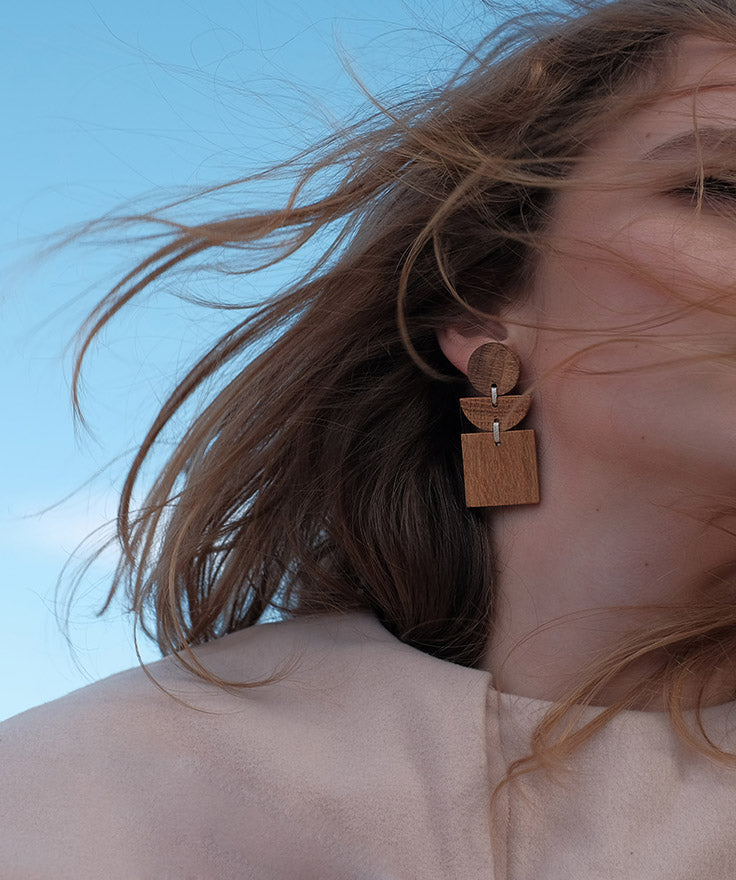 Geometric earrings formed by a circle, a semicircle and a square made of oak wood sewn together with ivory-coloured thread. Butterfly clasp. For pierced ears. They are warm and go with everything, weigh nothing and empower any look.Materials: