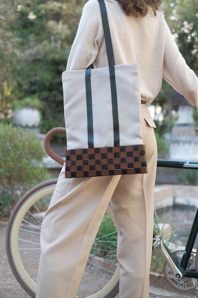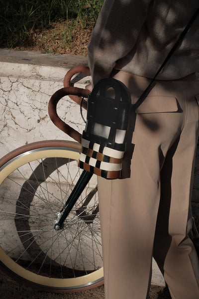 The MIMBRE series of bags is inspired by the symbolism of weaving, craftsmanship and the feeling of calm, tranquillity and wellbeing that they transmit. It is a revision of traditional basketry to adapt it to our everyday lives, using the colours of the sky, light, shadow and the basket.