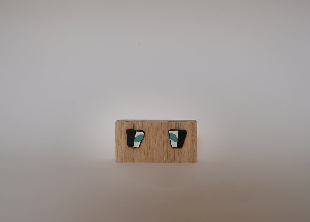 These earrings are a composition of simple geometric shapes of different colours and textures that when joined together resemble a face. Butterfly clasps. For pierced ears.