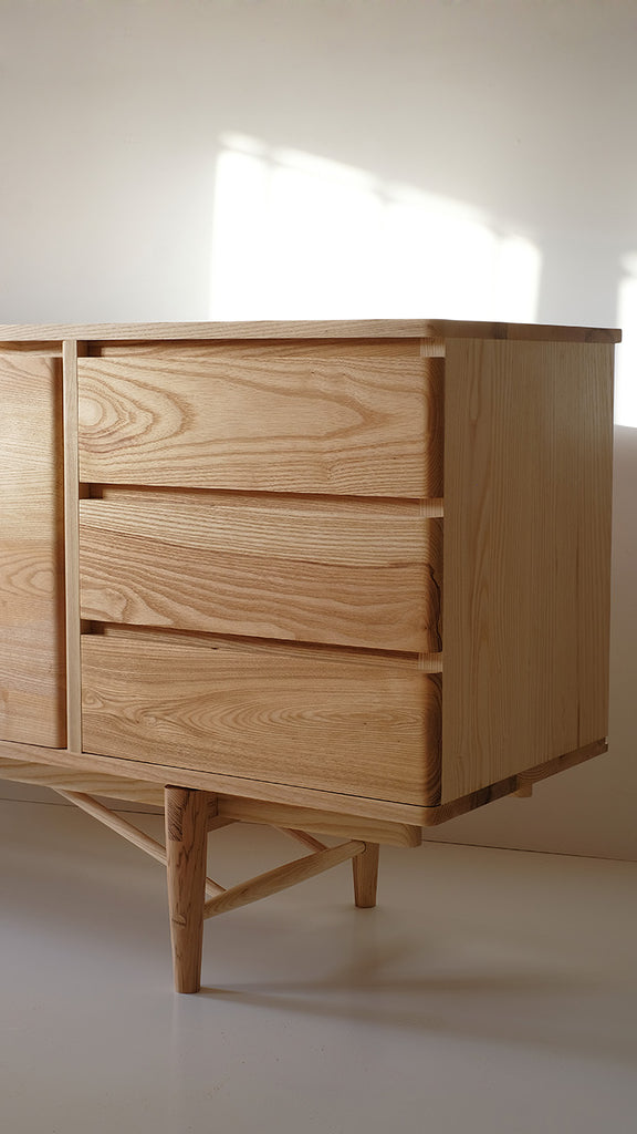 We counterpose two lines of carpentry seeking a dialogue between their languages: The body is emphatic and geometric, it plays with the curve to mark the rhythms of the furniture, but its language is minimalist. On the other hand, the legs are much more handcrafted, organic and natural. This contrast between languages is what gives character to the piece.