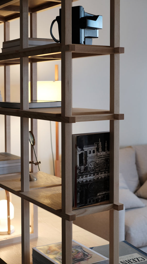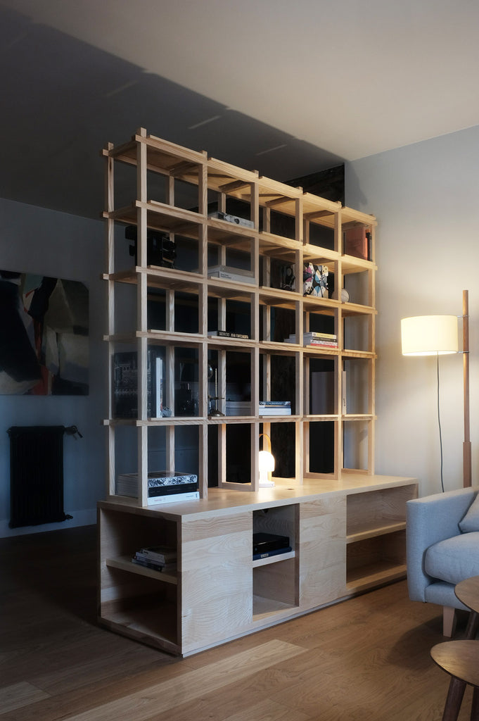 Piece composed of two elements: a bookcase and a sideboard. Designed as a free-standing piece of furniture to divide spaces. The base, made up of the sideboard, is a single massive module with openings on all sides, on which the slatted bookcase rests.
