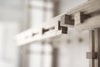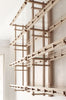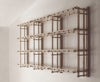 Shelving made up of a structure of solid ash wood slats anchored to the wall by means of firm vertical structural lines on which horizontal slats support the glass shelves, forming a light grid of great structural strength, ready to support heavy loads.