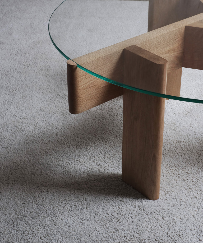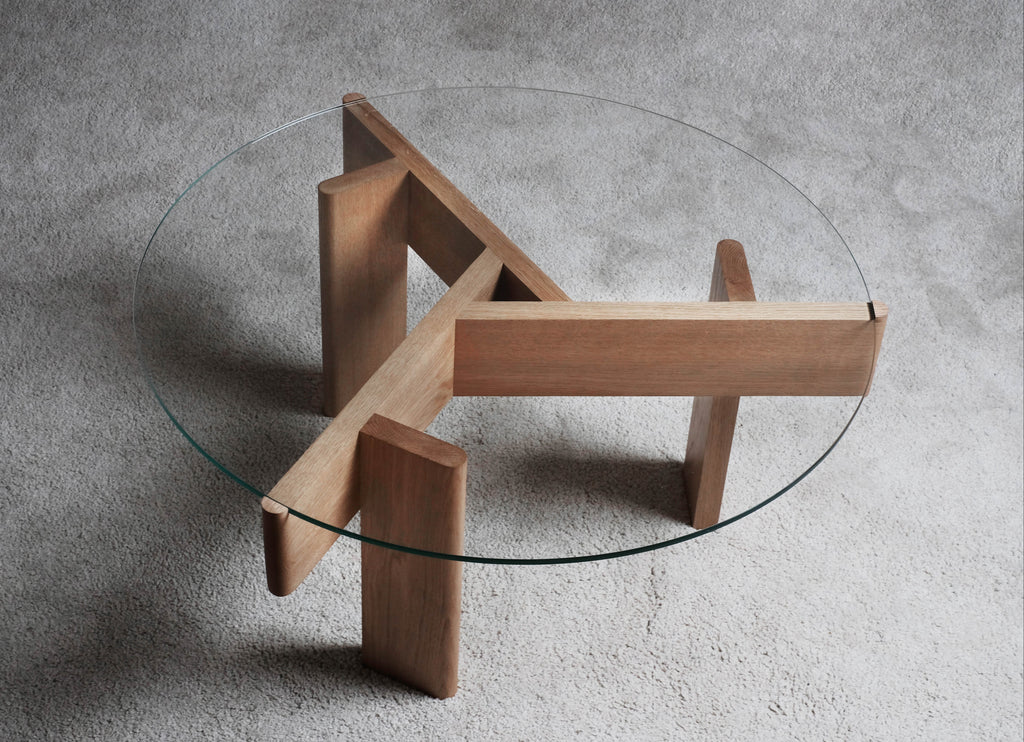Through its solid shapes this design seeks to convey a stone-like, sculptural air. The multiple orientations of its structural elements create planes in which the wood has different tones depending on how the light falls. It connects directly with the Brutalist architecture that emerged in the 1950s.
