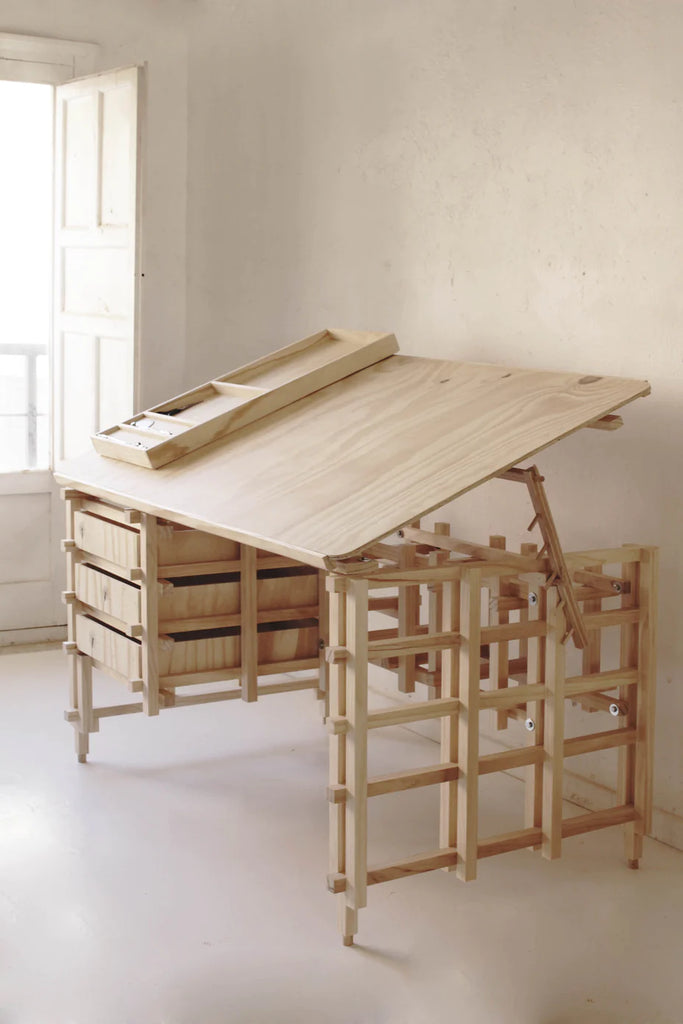 Drawing table adjustable in height, with 3 drawers for papers and an area for pencils and drawing material that is very accessible. Slatted pine wood structure with pine board top.