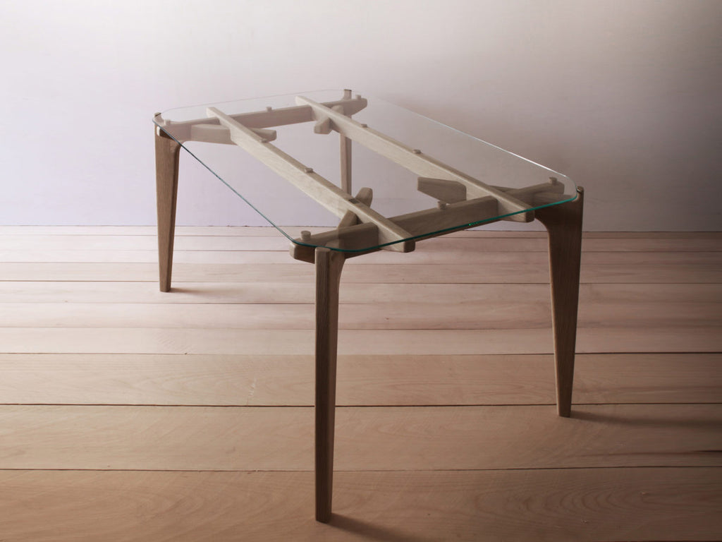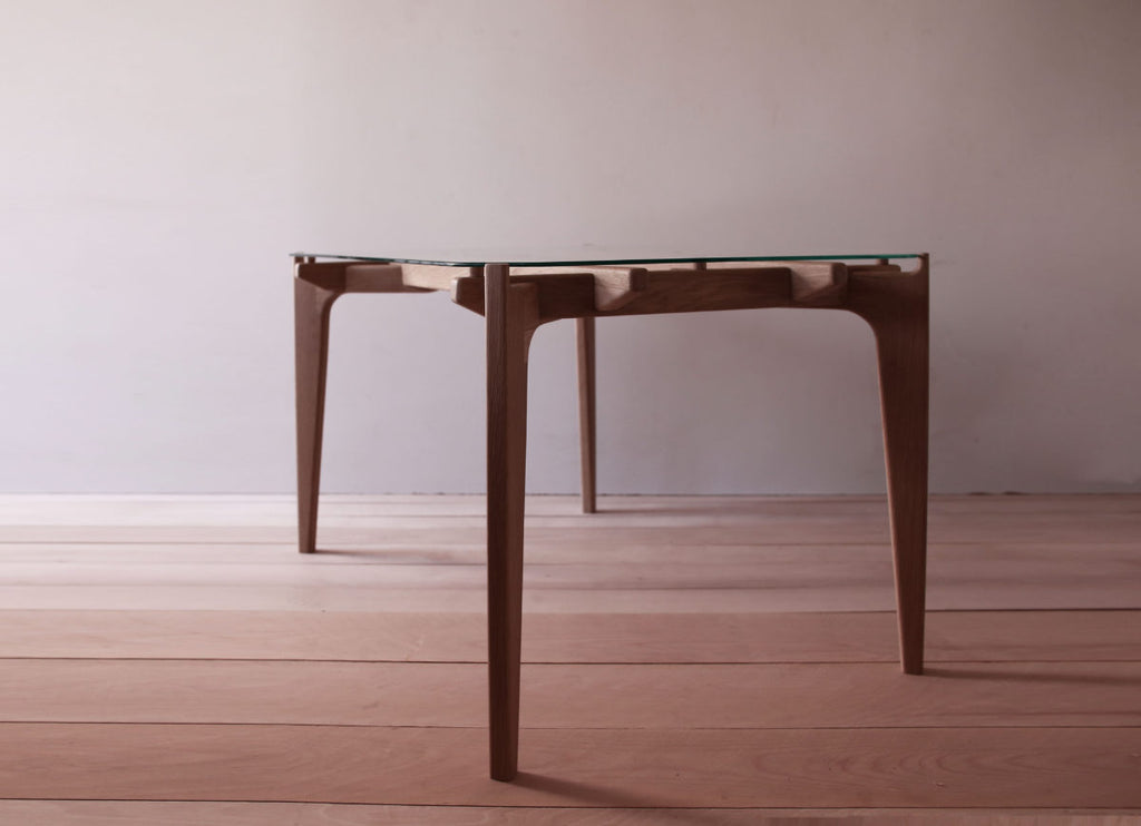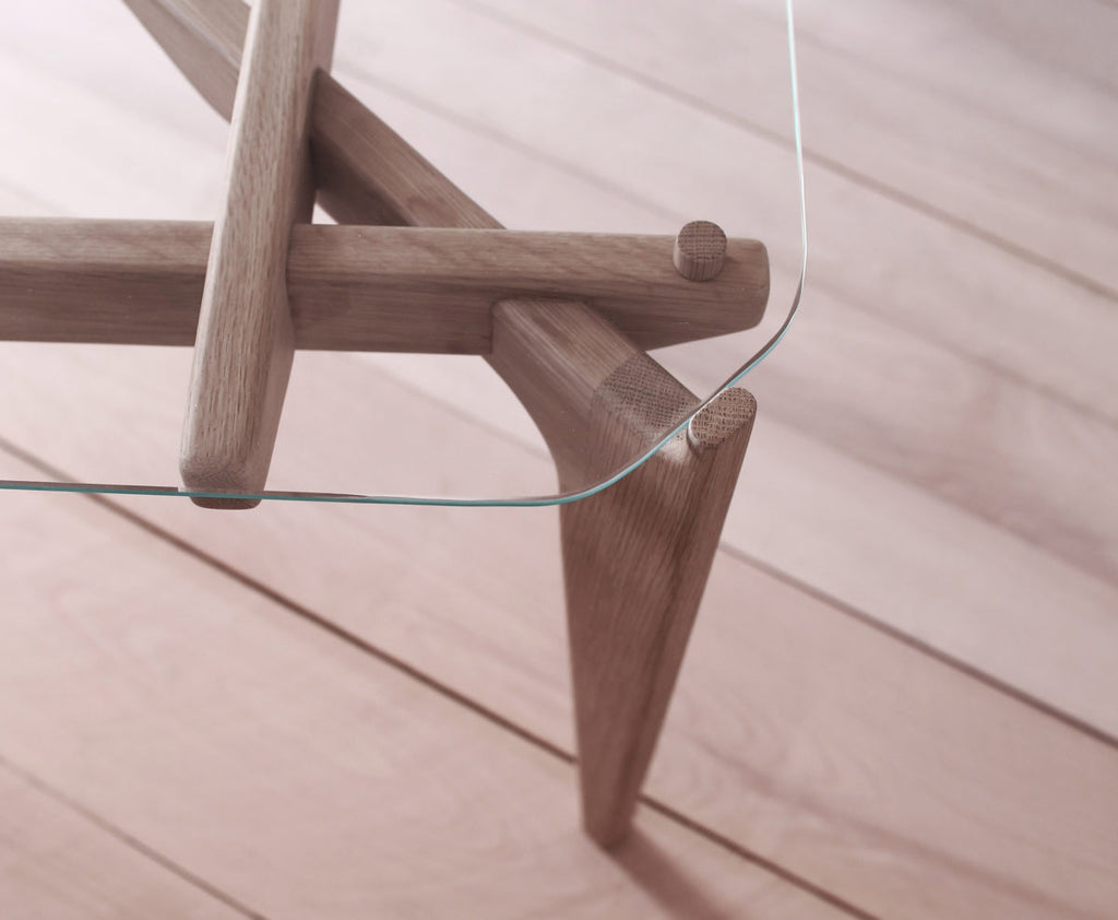 Coffee table with four supports. We wanted each of the pieces that make up the structure to be independently recognisable. The glass is held in place without the need for silicone or attachments. The structure itself limits its movement while separating from it by means of small support cylinders.
