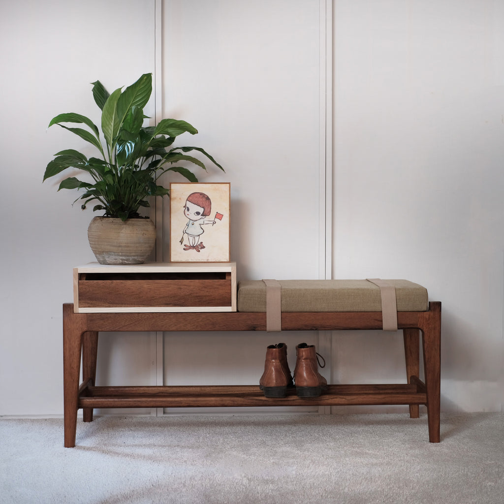 Furniture consisting of seat, upper support surface, drawer and and lower space for shoe storage.