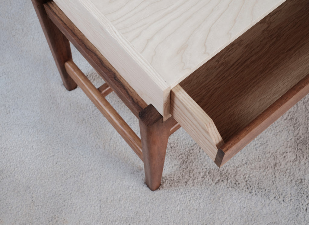 A piece that mixes two languages, one in the legs, inspired by the 50s, and the other in the drawer module  minimalist, austere and rotund.