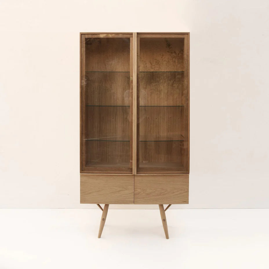 The Hesse display case is a contrasting piece. It seeks to harmonize two different but perfectly complementary languages. The legs use traditional English carpentry lines that refer us to classics such as the Windsor chair, while the body presents a strong and minimalist language.The conjunction of these lines generates a piece with a character that is as eclectic and personal as it is familiar and recognizable.