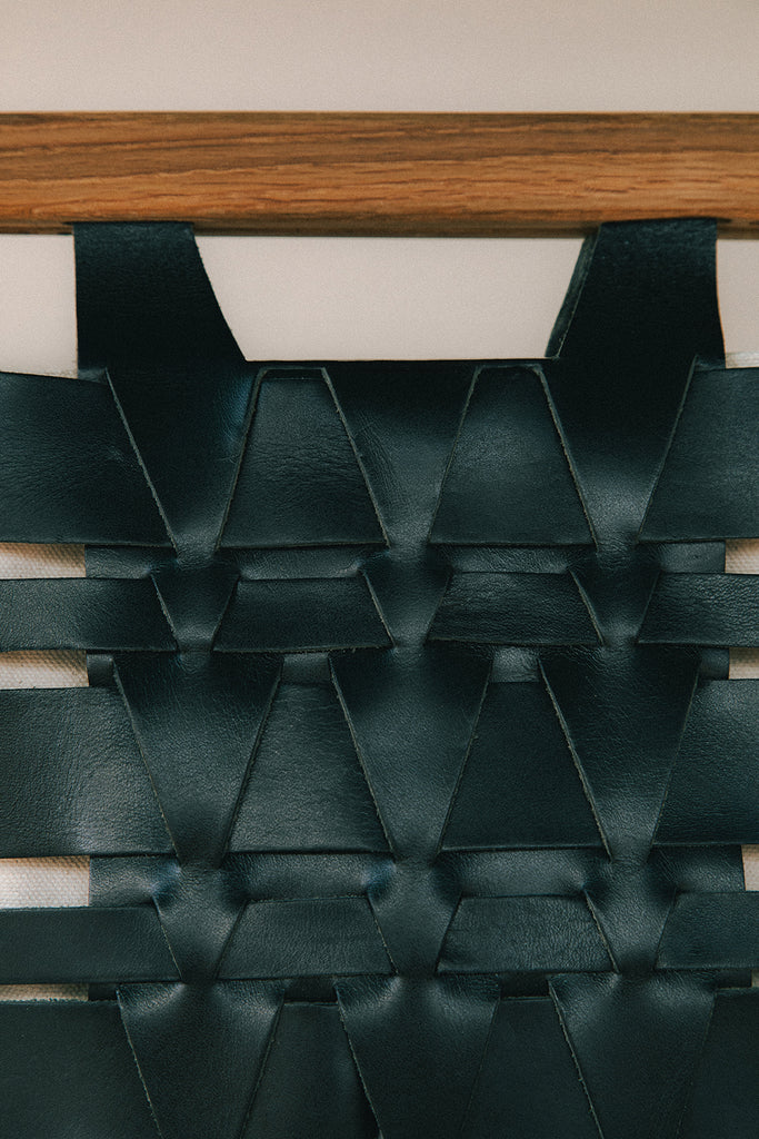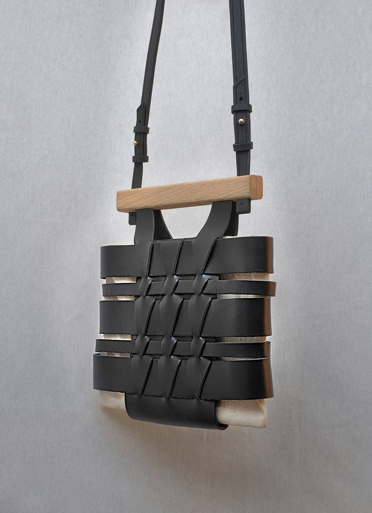 It is a medium-sized bag. It consists of a wooden handle and a braided leather structure that holds and safeguards a canvas bag while folding over itself generating a small pocket. A removable and adjustable strap of maximum length 120 cm is included.