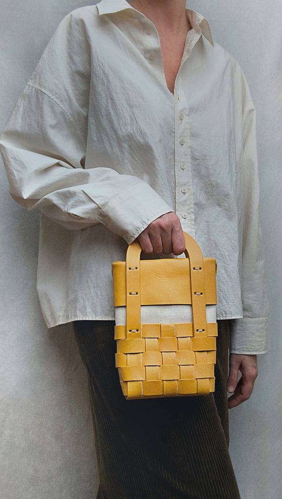 La serie de bolsos MIMBRE está inspirada en la simbología del trenzado, en la artesanía y en la sensación de calma, de tranquilidad y de bienestar que transmiten. Es una revisión de la cestería tradicional para adaptarla a nuestras vidas cotidianas, utilizando los colores del cielo, de la luz, de la sombra y de la cesta.