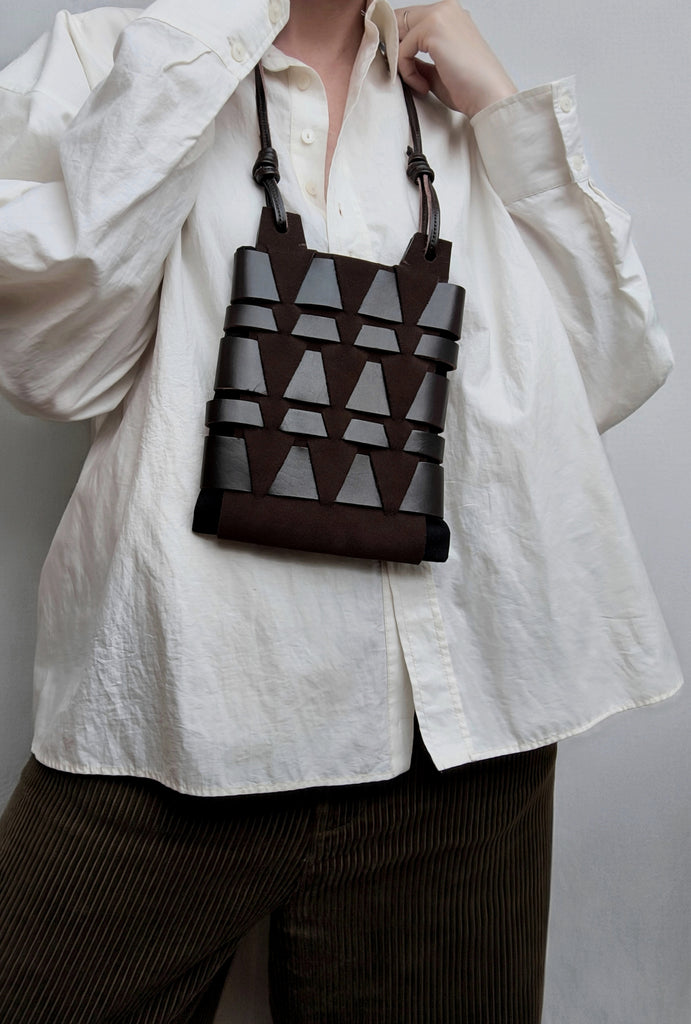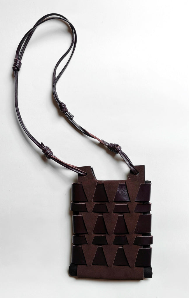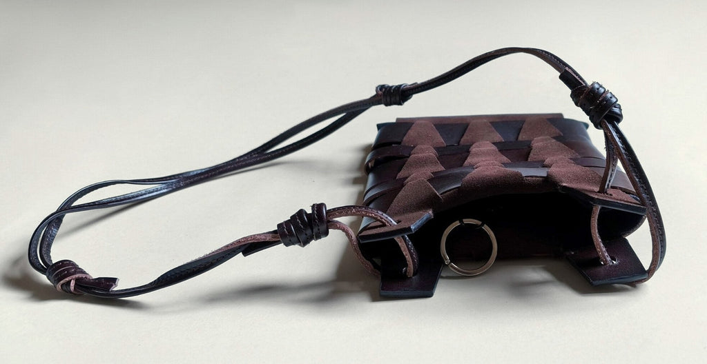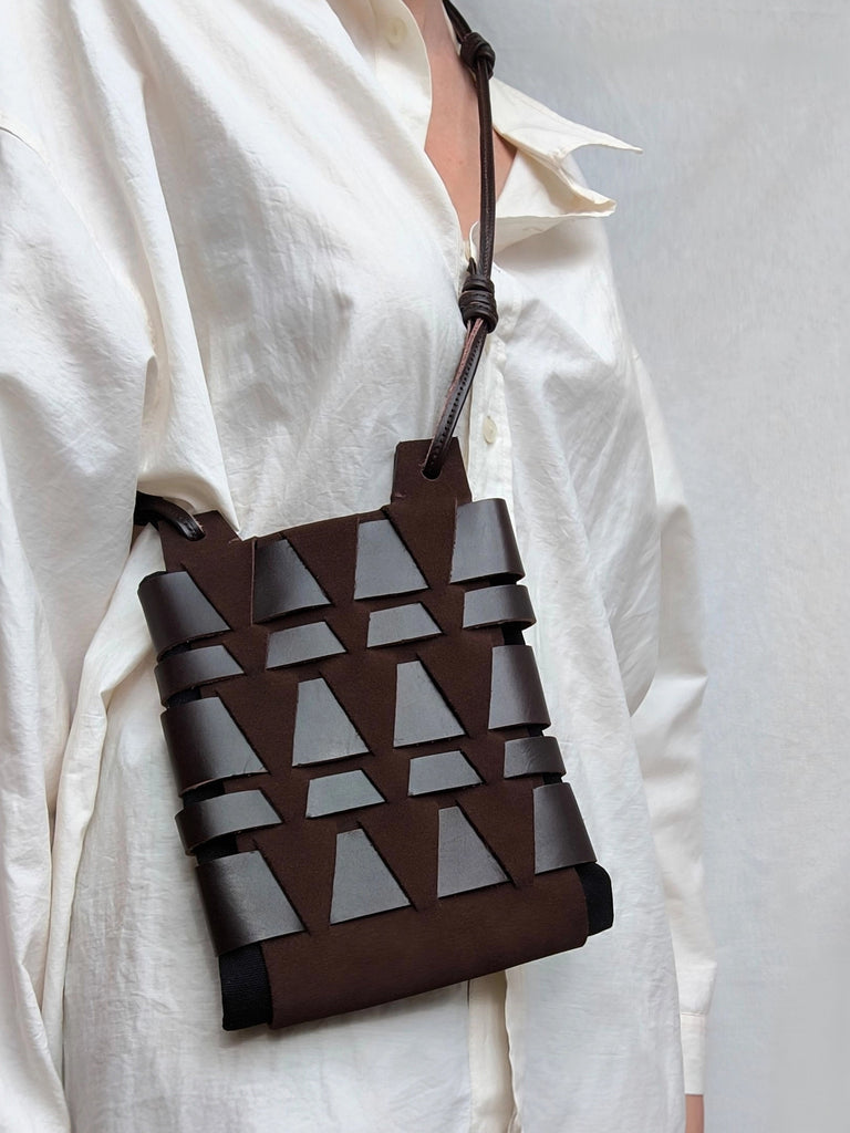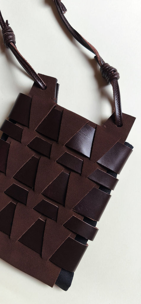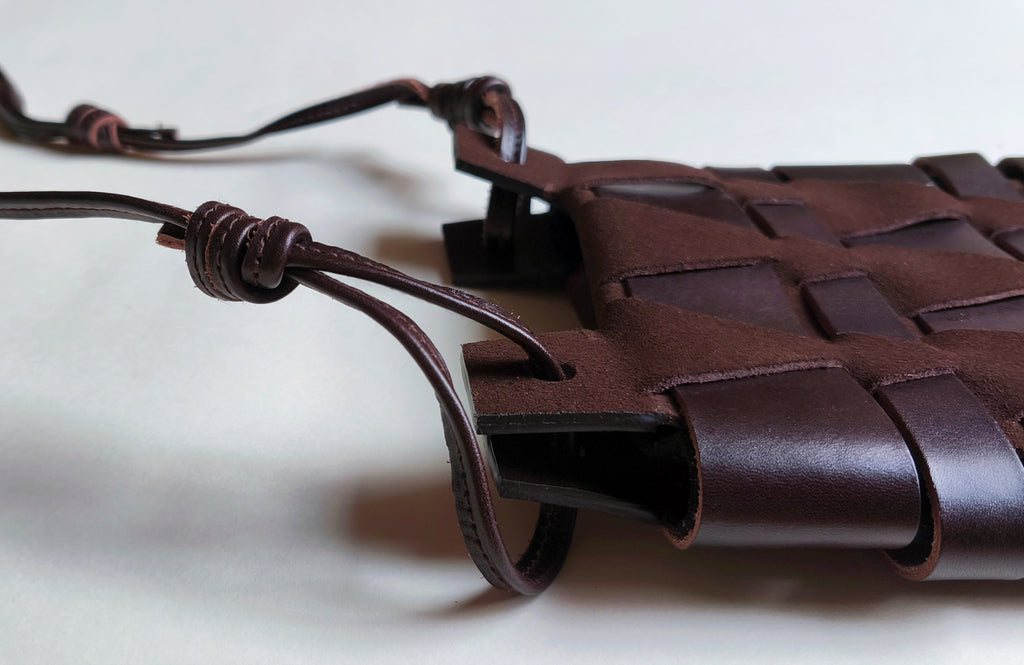 Small, flat bag made of a braided leather structure that holds and protects a canvas bag. Includes key ring and adjustable strap with a maximum length of 126 cm.