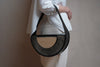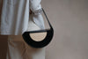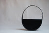 This bag is formed by three pieces of leather modelled to acquire a geometric and rigid shape. It is sewn entirely by hand using cross seams on the edges to reinforce its primitive character and contrast with its geometry. All the edges have been burnished and hand painted with water-based paints. The handle is completely integrated into the structure of the bag and has an intermediate size that allows it to be hung from the arm or shoulder.