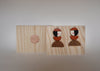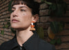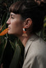 Earrings formed from a composition in wood and leather of semicircles, circles and fragments of these, of different sizes and colours that when joined together resemble the silhouette of a menina. Butterfly clasps. For pierced ears.