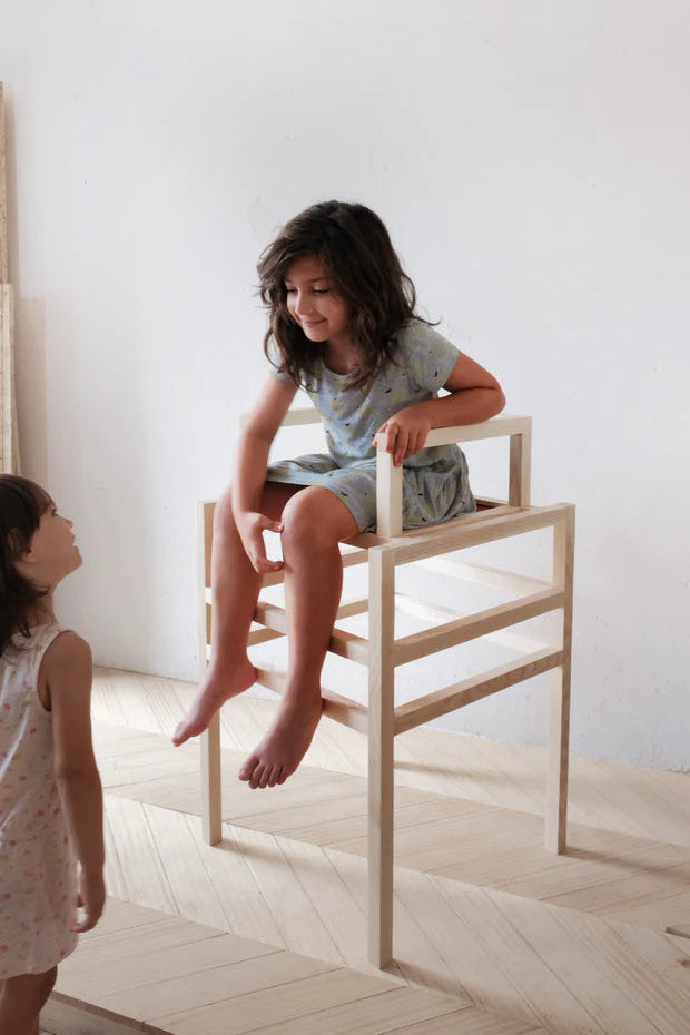 Inspired by the furniture of Donald Judd. It is a piece with a strong structural character, which guarantees safety in use and has a singular image. For us it is important the presence of the objects in the space when they are not being used and with this structure, we obtain a beautiful and balanced construction.