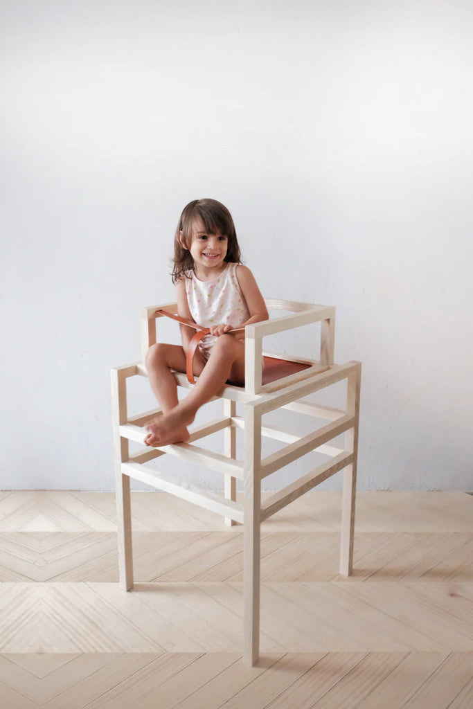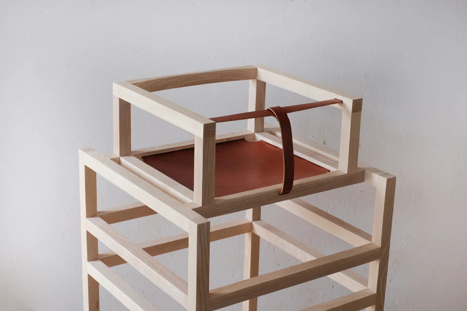 Solid European ash wood finished in vegetable oil. Top quality vegetable tanned leather hazelnut color.