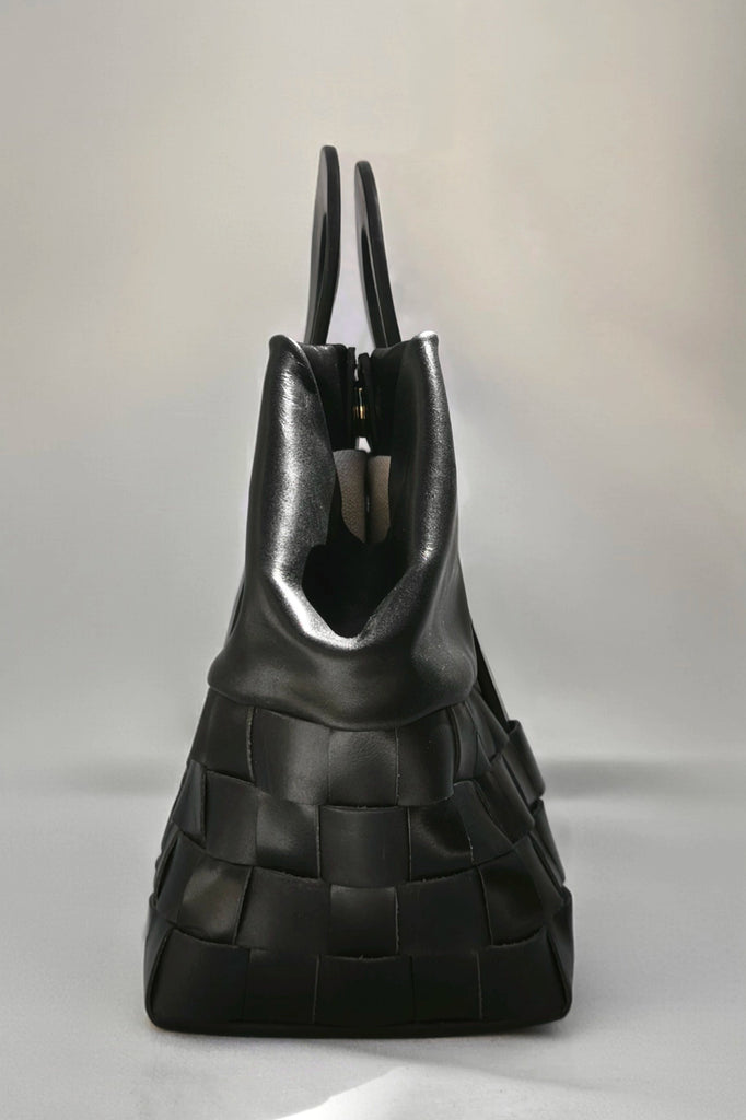 Braided leather bag with a versatile design that adapts to different capacities and uses: hand, shoulder, or cross-body.