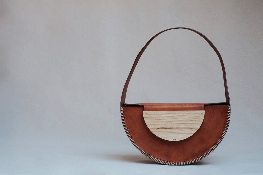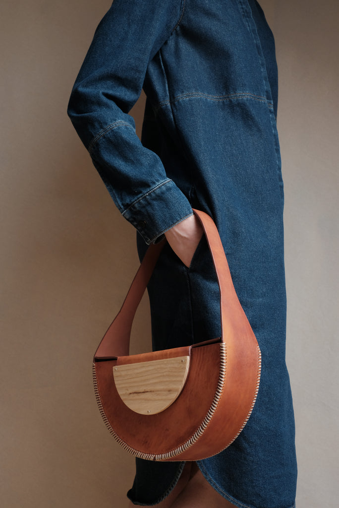 This bag is formed by three pieces of leather modelled to acquire a geometric and rigid shape. It is sewn entirely by hand using cross seams on the edges to reinforce its primitive character and contrast with its geometry. All the edges have been burnished and hand painted with water-based paints. The handle is completely integrated into the structure of the bag and has an intermediate size that allows it to be hung from the arm or shoulder.
