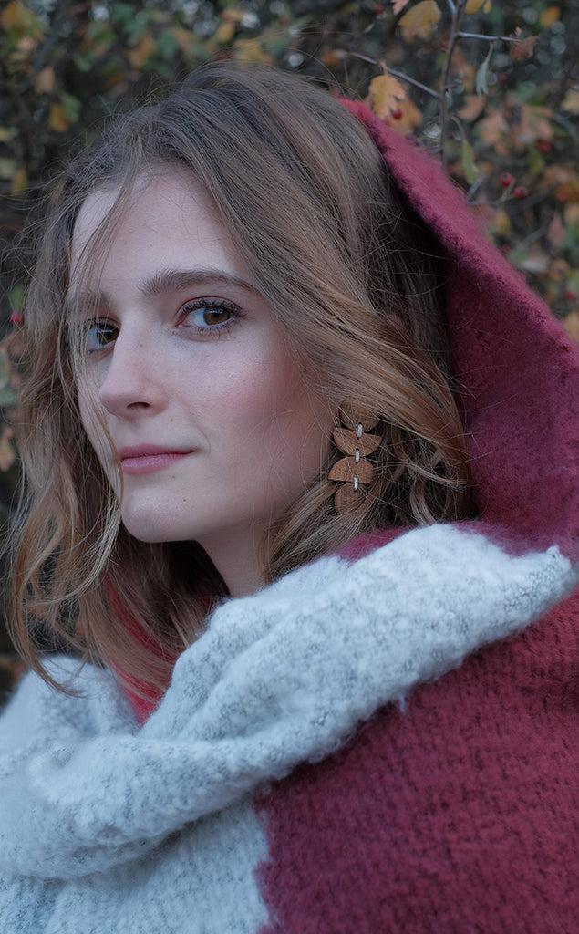 Floral and elongated earrings formed by oak wood circles and semicircles of different diameters sewn by means of ivory-coloured thread. Butterfly clasp. For pierced ears.