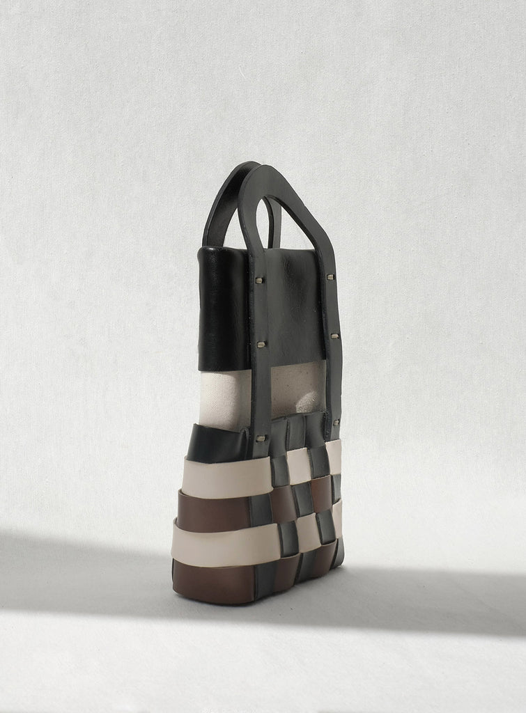 Consta de una estructura de piel trenzada de diferentes colores, que sujeta y resguarda una bolsa de lona. Incluye una correa extraíble y regulable de longitud máxima 120 cm. Cantos lujados y pintados a mano con pinturas al agua. Cierre de imán dorado libre de níquel. Base y asas reforzadas para que no se deforme.