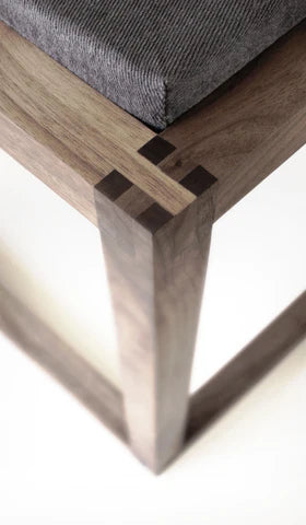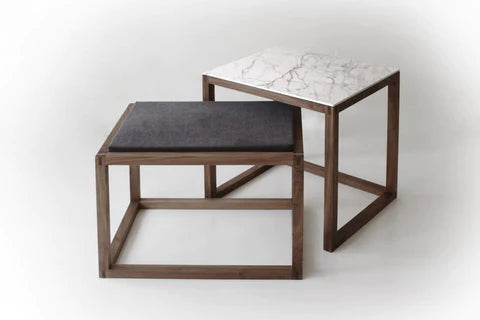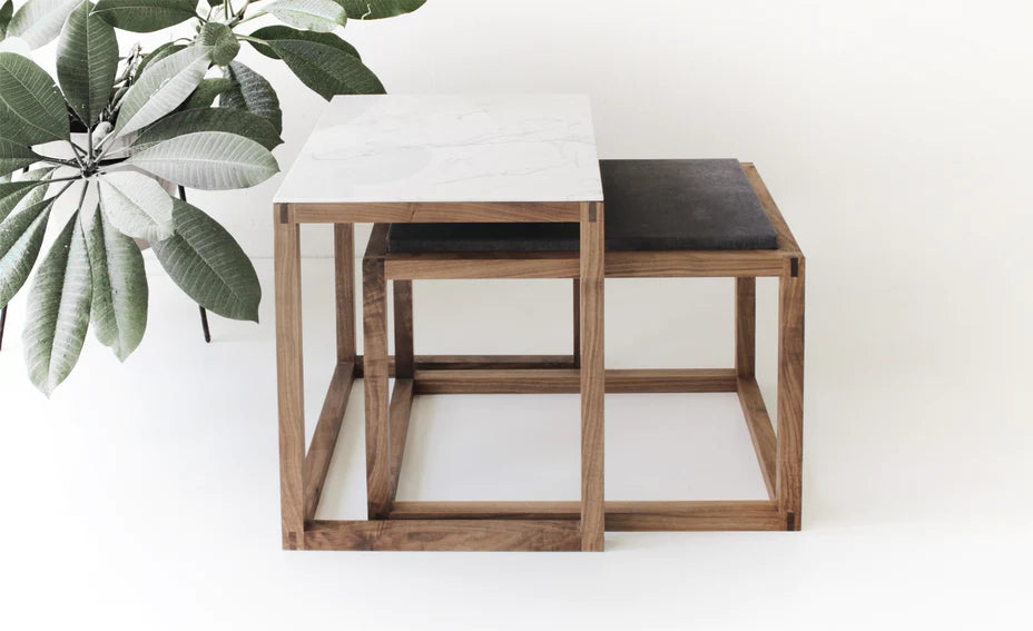 Mesita auxiliar y reposapiés que pueden almacenarse uno sobre otro ocupando el mínimo espacio cuando no están en uso. Los detalles de las esquinas son el gran detalle de diseño de estas piezas, inspirados en la carpintería tradicional japonesa.