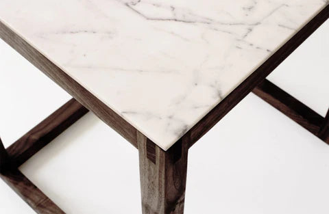Madera de nogal acabada al aceite de tung y mármol estatuario. Reposapiés tapizado en tejido de composición 63% algodón y 37% lino y 36.000 ciclos de lavado. Color a elegir.