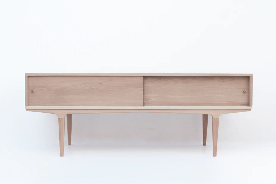 Mueble de puertas correderas con aperturas traseras para cableado que apoya sobre patas esbeltas de estilo escandinavo. Puertas correderas.