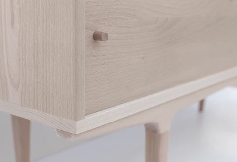 Cuerpo principal, puertas y patas en madera de haya maciza. Acabado en barniz al agua incoloro mate.